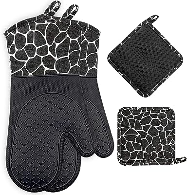 This set of oven mitts and potholders is a must for any kitchen. Made of silicone they are heat resistant and the mitts have a nice soft lining for comfort. The mitts are extra-long so will protect your forearms from hot steam and heat.
